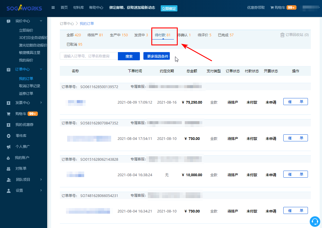 2. 點擊【訂單中心-我的訂單】,進入我的訂單頁面